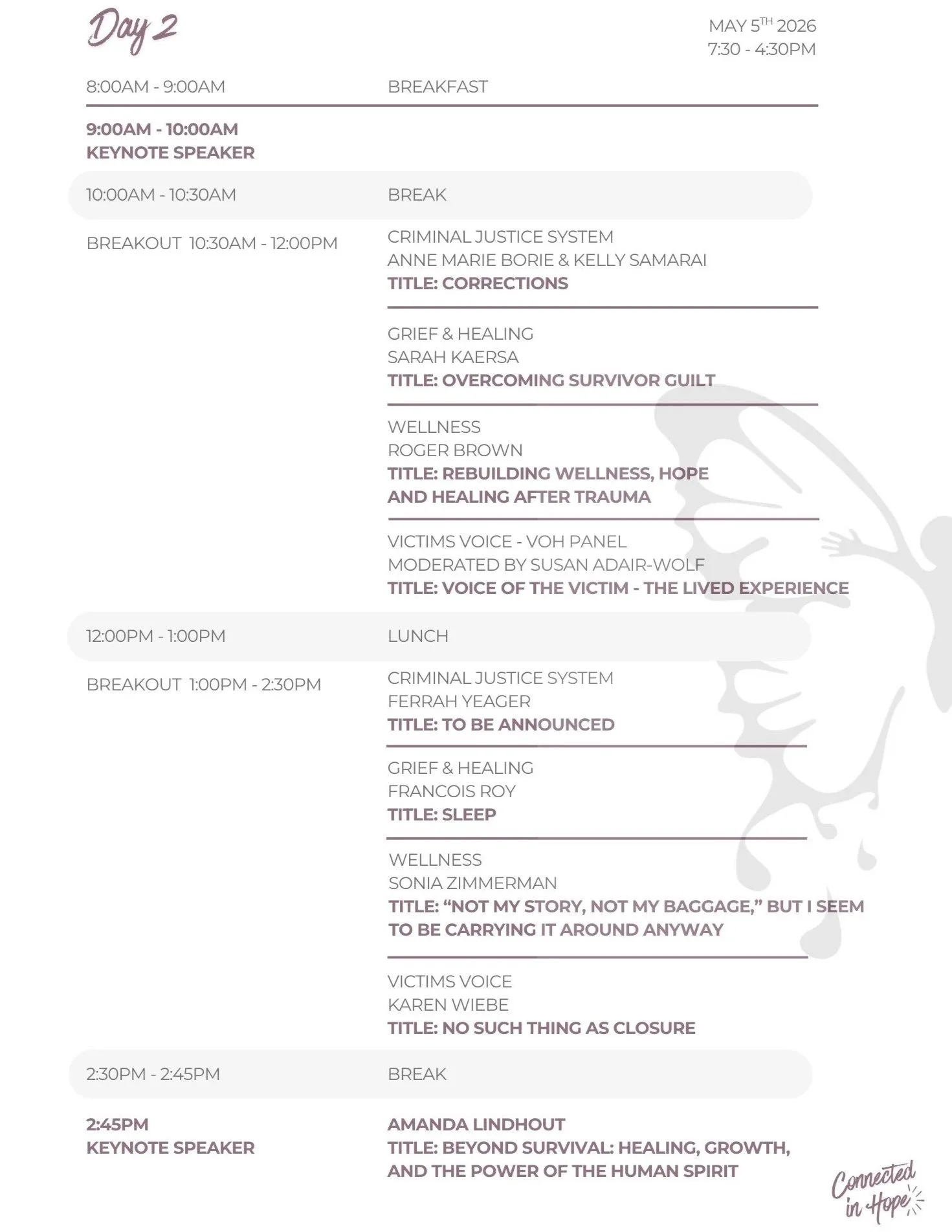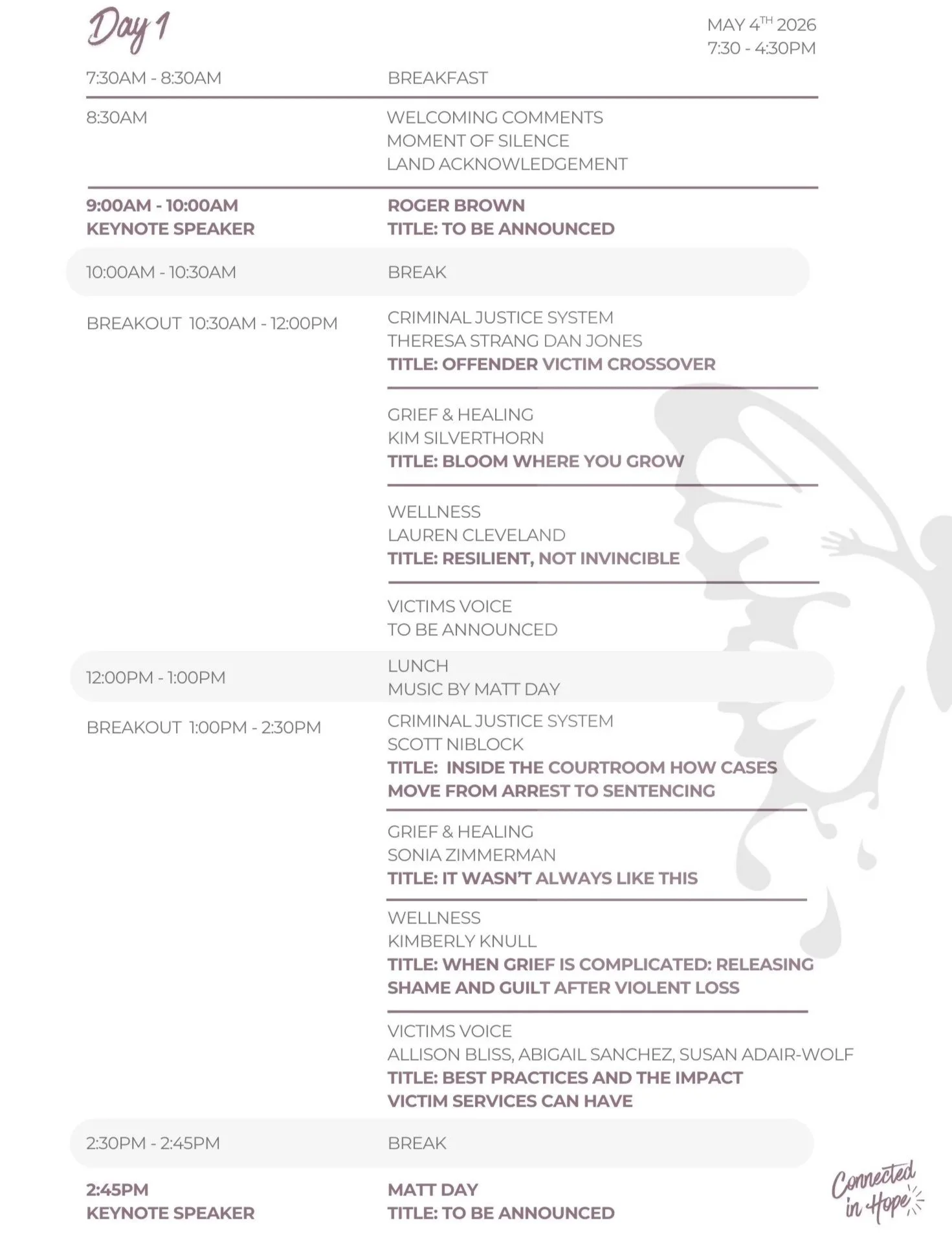 Join The Victims of Homicide Society (VOH) and the Parole Board of Canada for a transformative day bringing together co-victims of homicide, police investigators, victim services, EMS, firefighters, and funeral directors.